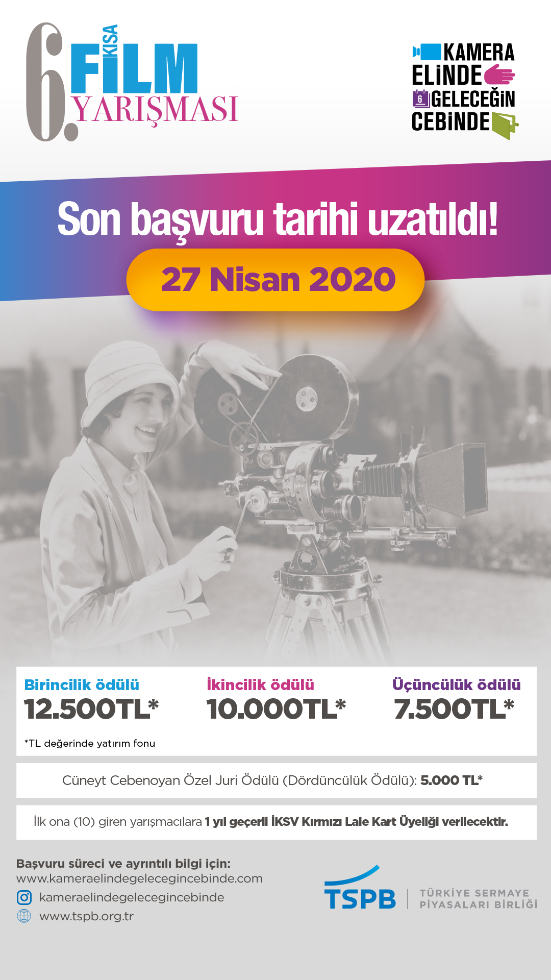 Birliğimiz, tarafından bu yıl altıncısı düzenlenen kısa film yarışmasında dereceye girenleri 12.500 TL’ye varan yatırım fonu kazanma fırsatı ve çeşitli hediyeler bekliyor.