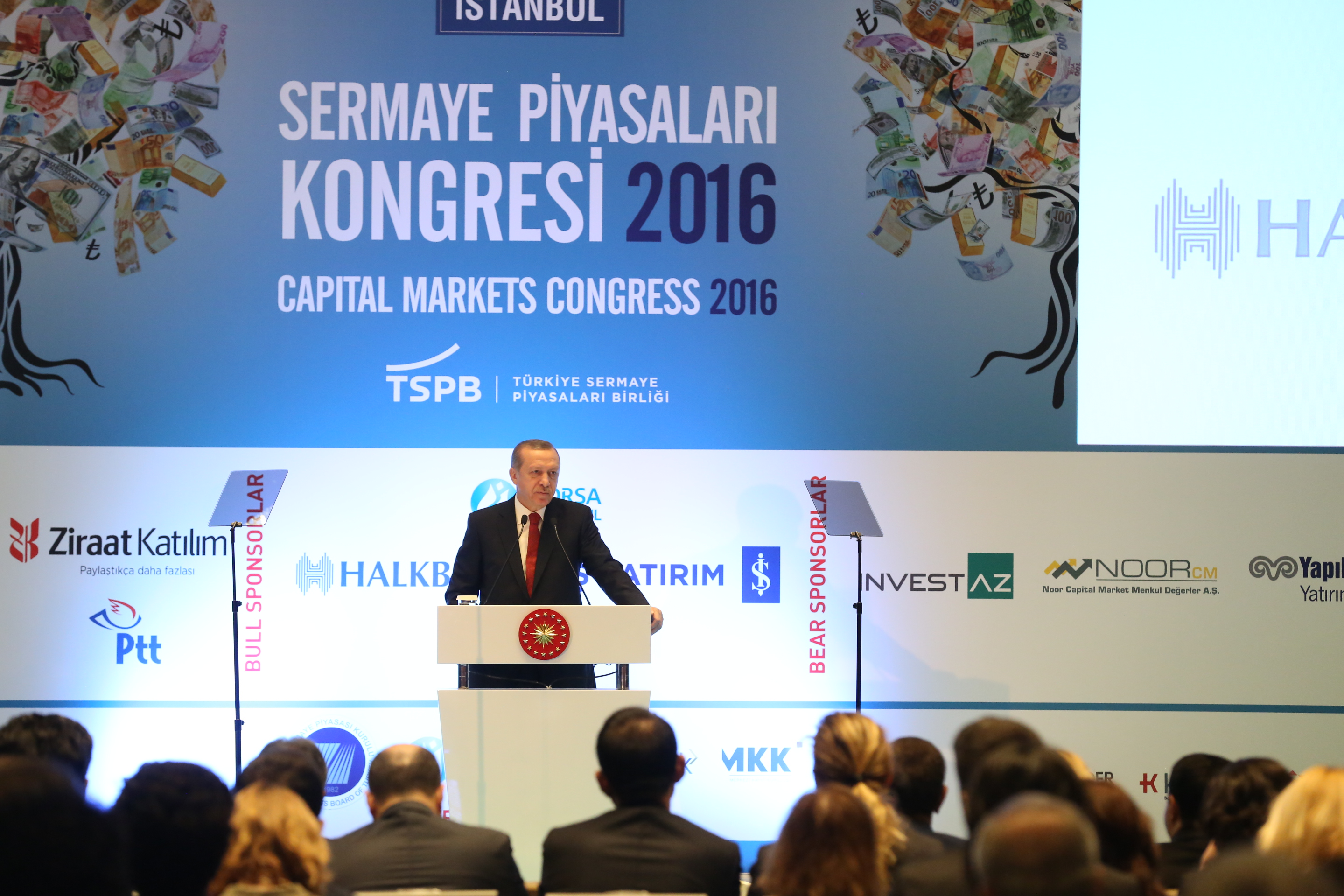 Cumhurbaşkanı Recep Tayyip Erdoğan Sermaye Piyasaları Kongresi’nde yaptığı açılış konuşmasında, Kongrenin ülke ekonomisi, yatırımcılar ve tüm dünya için hayırlı olmasını diledi. İstanbul’u finans merkezi yapma yönündeki çabalarının, bu kongreyle bir adım daha ileriye gittiğini belirten Erdoğan, küresel bir platforma dönüşeceğini düşündüğü bu kongrenin, gelecek yıllarda daha geniş katılımlarla ve daha etkili tartışma konularıyla devam edeceğini ümit ettiğini söyledi.